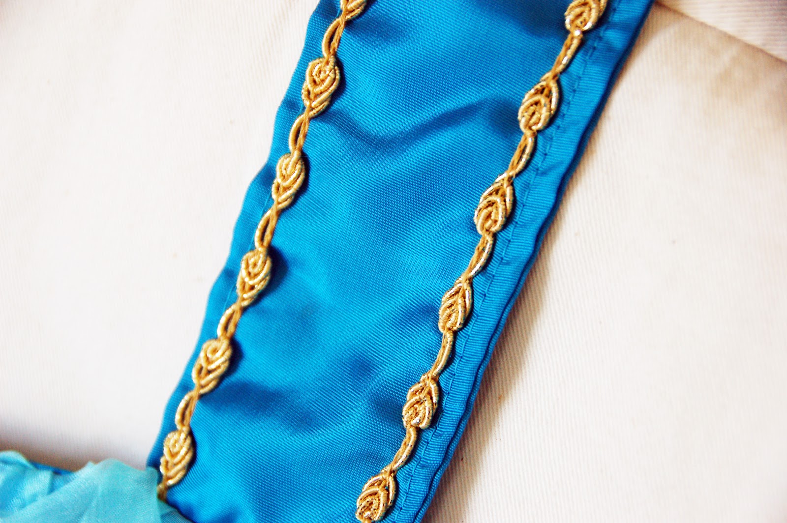 The bottom part of the bodice is just the darker blue silk with decorative beaded trim and gold metallic braided trim. I sandwiched the beaded trim between the main fabric and the lining so the beading would hang down. Then I added the gold trim and machine sewed it in place, which was a new and not exciting experience.