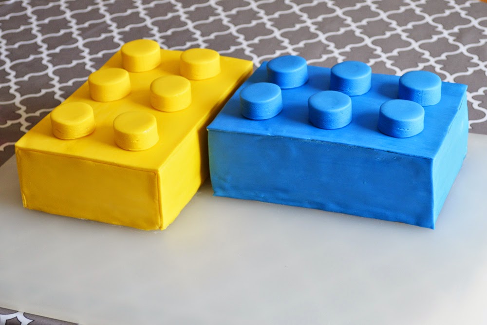 Once the cakes were covered, I rolled the leftover fondant so it was roughly an inch thick. Then I used a small round cutter to cut out circles for the "bumps." In hindsight, I would have made them slightly thinner/shorter. Nolan wanted 2x3 bumps because he said those are more rare pieces. I just used a little water to adhere the bumps to the covered cakes. I gave both cakes a quick wipe-down with a damp paper towel to remove any leftover cornstarch and to give them a shinier finish (like a real Lego). Voila!